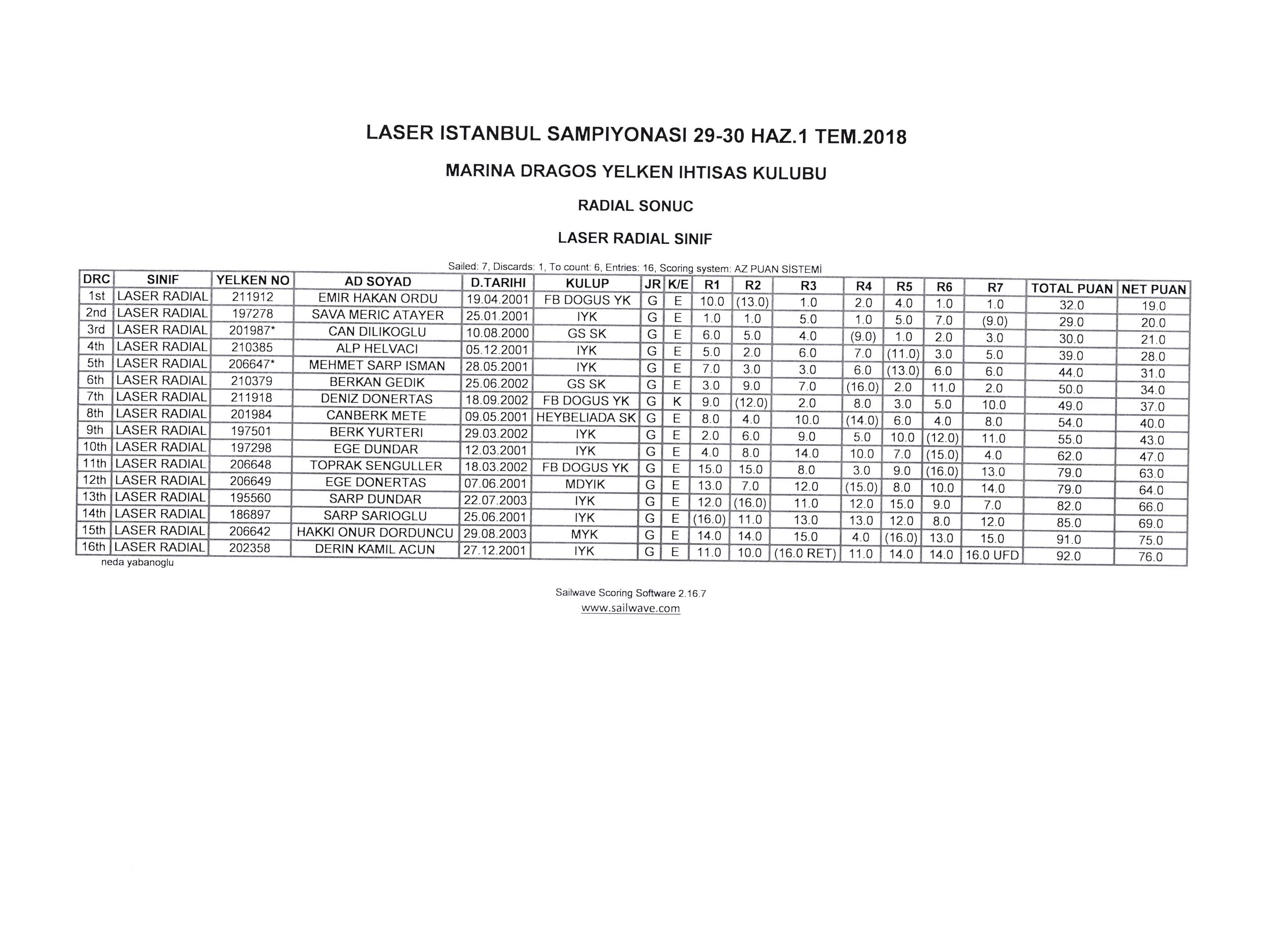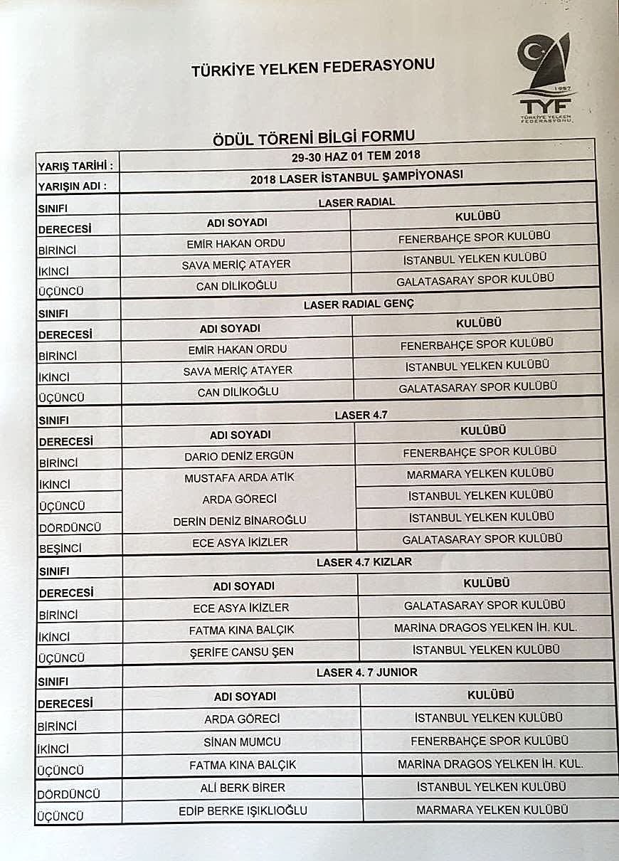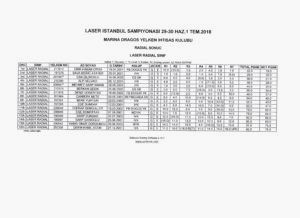 2019 Laser İstanbul Şampiyonası Sonuçları